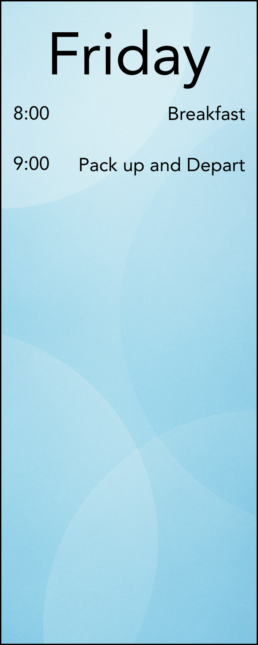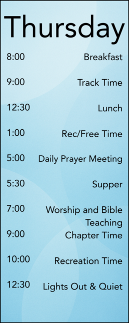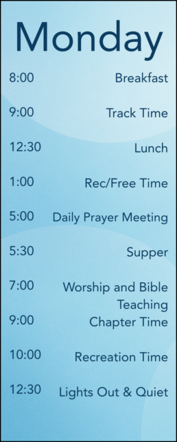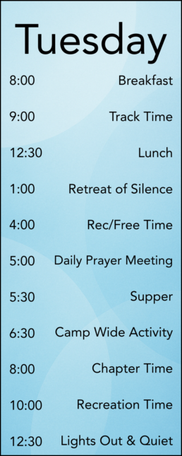 Below is the schedule—designed with a healthy balance of track time, Large Group, free time, and space to focus on your chapter and friendships.